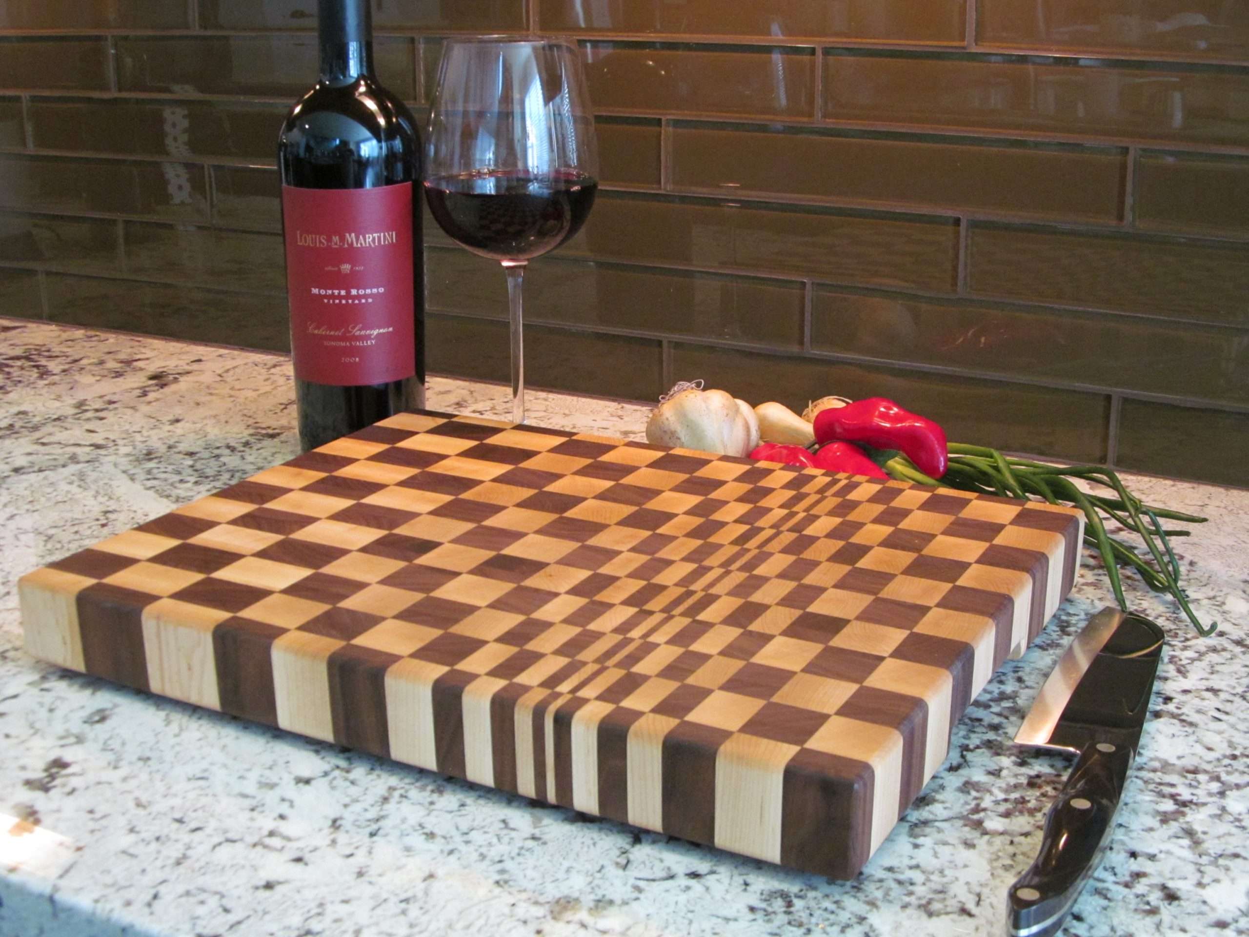 ♥ This cutting board is 12″ x 15-1/2″ x 1-1/2″ and is made from Hard Maple and American Walnut.