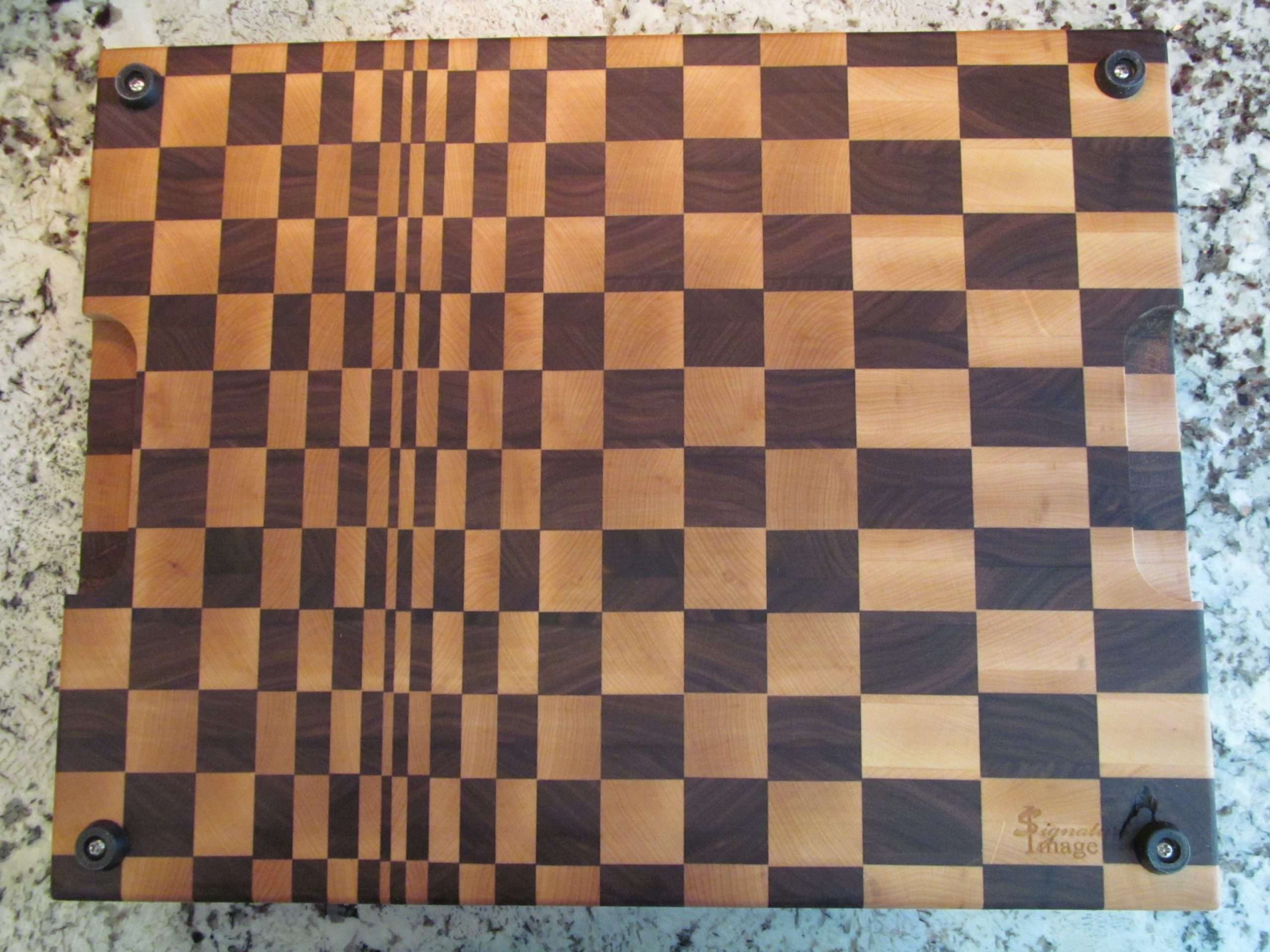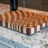 End grain cutting boards are more scratch resistant and better for your knives. This board also adds a unique 3-D optical illusion effect. Perfect for chopping or serving. This cutting board includes non-slip rubber feet.
